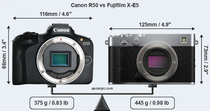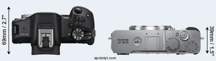 The physical size and weight of the Canon R50 and the Fujifilm X-E5 are illustrated in the side-by-side display below. The two cameras are presented according to their relative size. Three consecutive views from the front, the top, and the rear side are shown. All width, height and depth dimensions are rounded to the nearest millimeter.