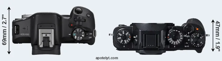 The side-by-side display below illustrates the physical size and weight of the Canon R50 and the Fujifilm X-T1. The two cameras are presented according to their relative size. Three successive views from the front, the top, and the rear are shown. All width, height and depth dimensions are rounded to the nearest millimeter.