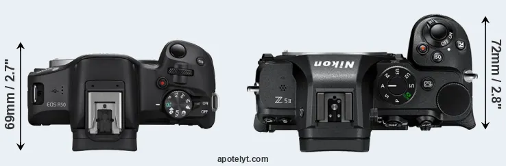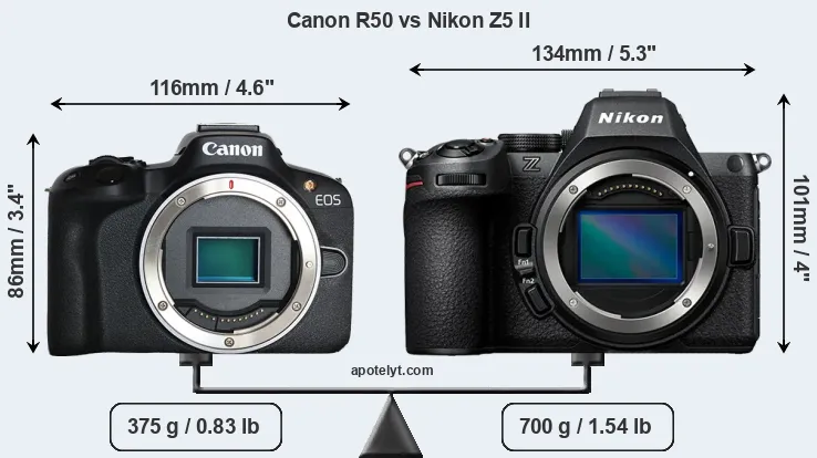An illustration of the physical size and weight of the Canon R50 and the Nikon Z5 II is provided in the side-by-side display below. The two cameras are presented according to their relative size. Three successive views from the front, the top, and the rear are shown. All width, height and depth dimensions are rounded to the nearest millimeter.