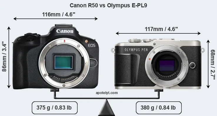If the front view area (width x height) of the cameras is taken as an aggregate measure of their size, the Olympus E-PL9 is notably smaller (20 percent) than the Canon R50. However, the E-PL9 is slightly heavier (1 percent) than the R50. In this context, it is worth noting that neither the R50 nor the E-PL9 are weather-sealed.