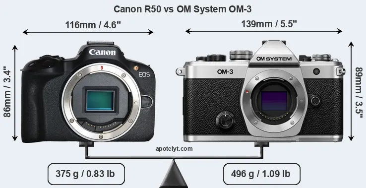 If the front view area (width x height) of the cameras is taken as an aggregate measure of their size, the OM System OM-3 is notably larger (24 percent) than the Canon R50. Moreover, the OM-3 is markedly heavier (32 percent) than the R50. It is noteworthy in this context that the OM-3 is splash and dust-proof, while the R50 does not feature any corresponding weather-sealing.