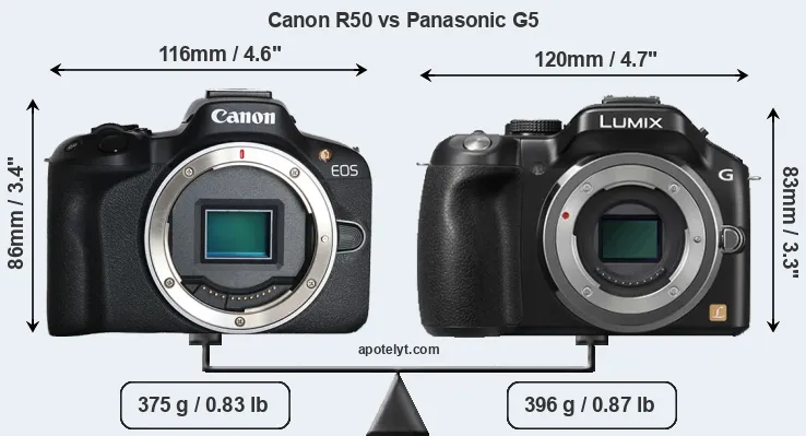 The side-by-side display below illustrates the physical size and weight of the Canon R50 and the Panasonic G5. The two cameras are presented according to their relative size. Three consecutive perspectives from the front, the top, and the back are available. All width, height and depth measures are rounded to the nearest millimeter.