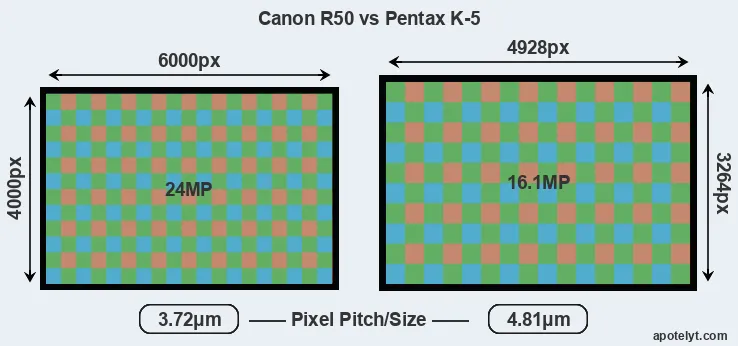 Despite having a smaller sensor, the Canon R50 offers a higher resolution of 24 megapixels, compared with 16.1 MP of the Pentax K-5. This megapixels advantage comes at the cost of a higher pixel density and a smaller size of the individual pixel (with a pixel pitch of 3.72μm versus 4.81μm for the K-5). However, it should be noted that the R50 is much more recent (by 12 years and 4 months) than the K-5, and its sensor will have benefitted from technological advances during this time that make it possible to gather light more efficiently.