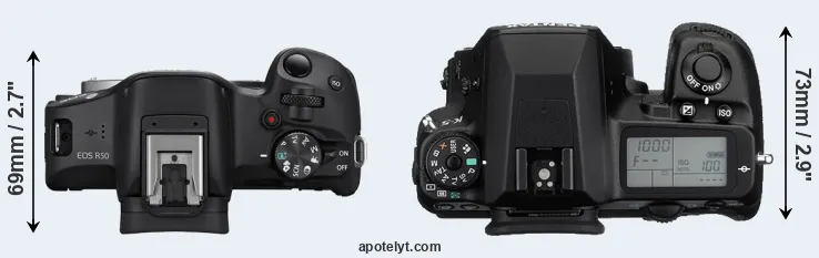 The side-by-side display below illustrates the physical size and weight of the Canon R50 and the Pentax K-5. The two cameras are presented according to their relative size. Three consecutive perspectives from the front, the top, and the back are available. All width, height and depth dimensions are rounded to the nearest millimeter.