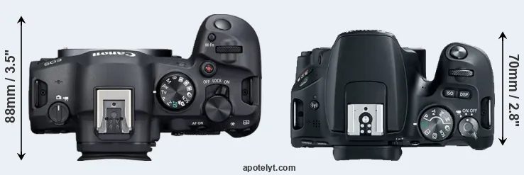 If the front view area (width x height) of the cameras is taken as an aggregate measure of their size, the Canon SL2 is notably smaller (16 percent) than the Canon R6 Mark II. Moreover, the SL2 is markedly lighter (32 percent) than the R6 Mark II. It is worth mentioning in this context that the R6 Mark II is splash and dust resistant, while the SL2 does not feature any corresponding weather-sealing.