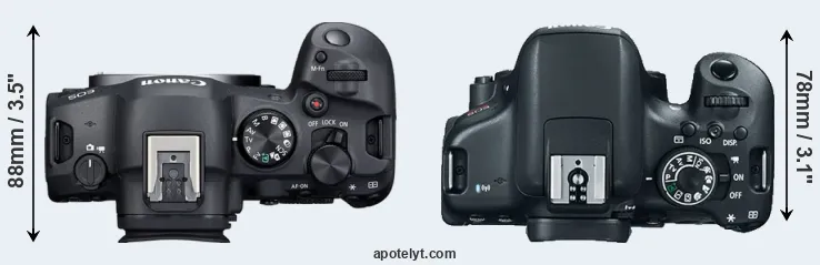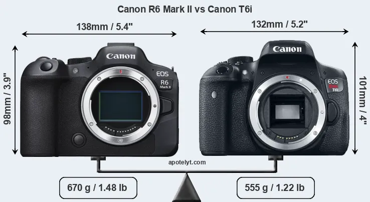 If the front view area (width x height) of the cameras is taken as an aggregate measure of their size, the Canon T6i is somewhat smaller (1 percent) than the Canon R6 Mark II. Moreover, the T6i is markedly lighter (17 percent) than the R6 Mark II. It is worth mentioning in this context that the R6 Mark II is splash and dust resistant, while the T6i does not feature any corresponding weather-sealing.
