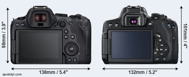 The physical size and weight of the Canon R6 Mark II and the Canon T6i are illustrated in the side-by-side display below. The two cameras are presented according to their relative size. Three consecutive views from the front, the top, and the rear side are shown. All size dimensions are rounded to the nearest millimeter.