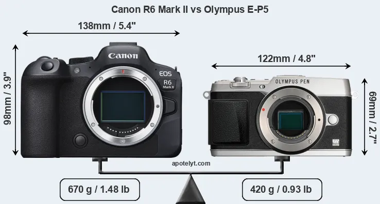 If the front view area (width x height) of the cameras is taken as an aggregate measure of their size, the Olympus E-P5 is considerably smaller (38 percent) than the Canon R6 Mark II. Moreover, the E-P5 is substantially lighter (37 percent) than the R6 Mark II. It is worth mentioning in this context that the R6 Mark II is splash and dust resistant, while the E-P5 does not feature any corresponding weather-sealing.