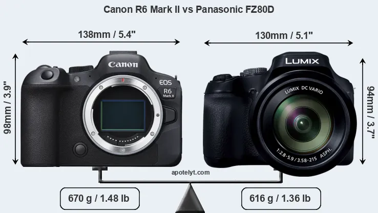 The physical size and weight of the Canon R6 Mark II and the Panasonic FZ80D are illustrated in the side-by-side display below. The two cameras are presented according to their relative size. Three consecutive perspectives from the front, the top, and the back are available. All width, height and depth dimensions are rounded to the nearest millimeter.