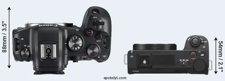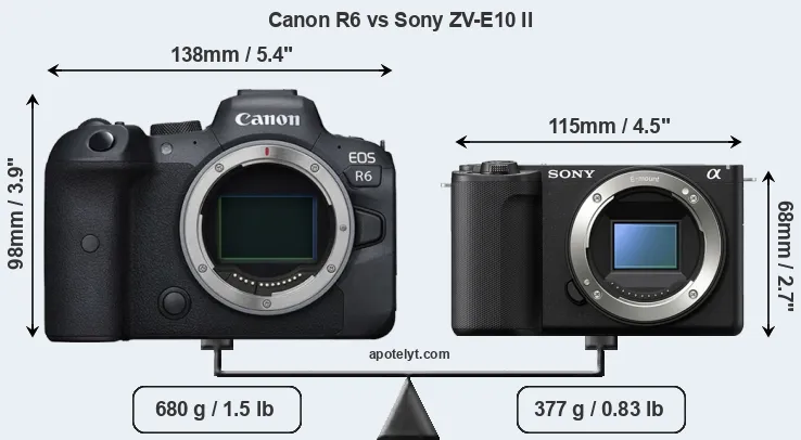 The side-by-side display below illustrates the physical size and weight of the Canon R6 and the Sony ZV-E10 II. The two cameras are presented according to their relative size. Three consecutive perspectives from the front, the top, and the back are available. All size dimensions are rounded to the nearest millimeter.