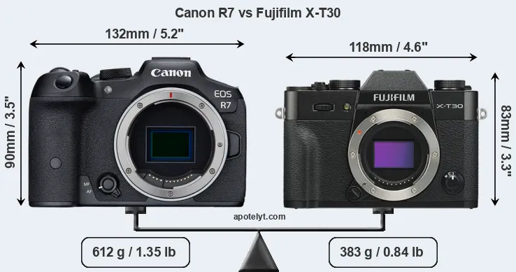 The physical size and weight of the Canon R7 and the Fujifilm X-T30 are illustrated in the side-by-side display below. The two cameras are presented according to their relative size. Three consecutive perspectives from the front, the top, and the back are available. All width, height and depth dimensions are rounded to the nearest millimeter.