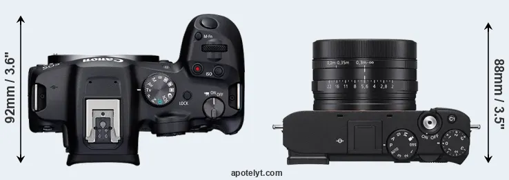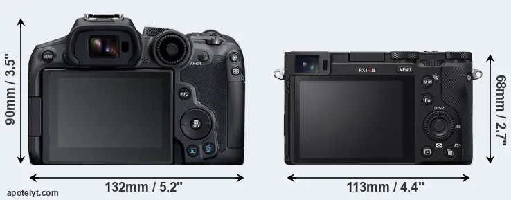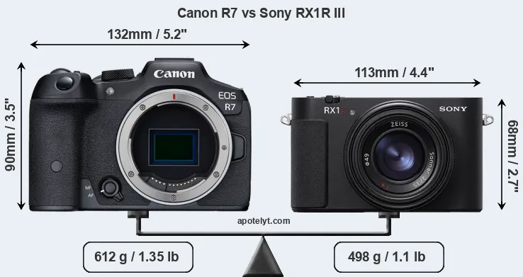 An illustration of the physical size and weight of the Canon R7 and the Sony RX1R III is provided in the side-by-side display below. The two cameras are presented according to their relative size. Three consecutive views from the front, the top, and the rear side are shown. All width, height and depth measures are rounded to the nearest millimeter.