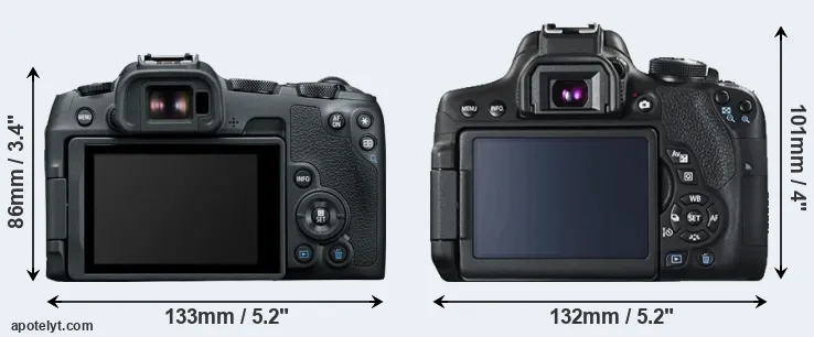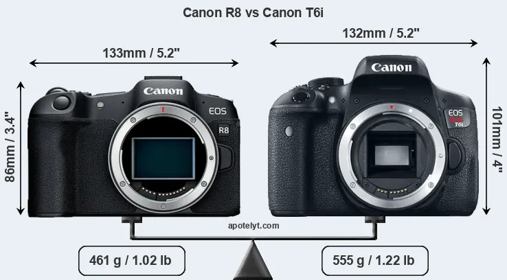 The side-by-side display below illustrates the physical size and weight of the Canon R8 and the Canon T6i. The two cameras are presented according to their relative size. Three successive views from the front, the top, and the rear are shown. All width, height and depth measures are rounded to the nearest millimeter.