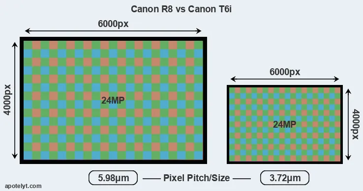 Even though the R8 has a larger sensor, both cameras offer the same resolution of 24 megapixels. This implies that the R8 has a lower pixel density and larger individual pixels (with a pixel pitch of 5.98μm versus 3.72μm for the T6i), which gives it a potential advantage in terms of light gathering capacity. In addition, the R8 is much more recent (by 8 years) than the T6i, and its sensor will have benefitted from technological advances during this time.