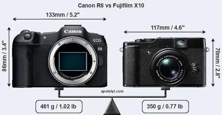 The side-by-side display below illustrates the physical size and weight of the Canon R8 and the Fujifilm X10. The two cameras are presented according to their relative size. Three consecutive perspectives from the front, the top, and the back are available. All width, height and depth dimensions are rounded to the nearest millimeter.