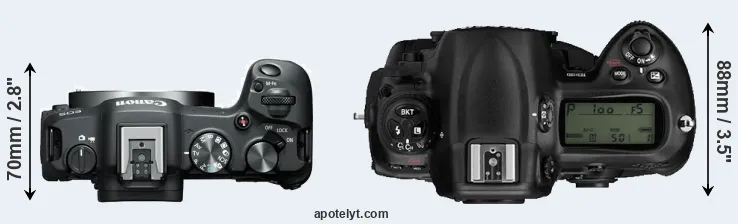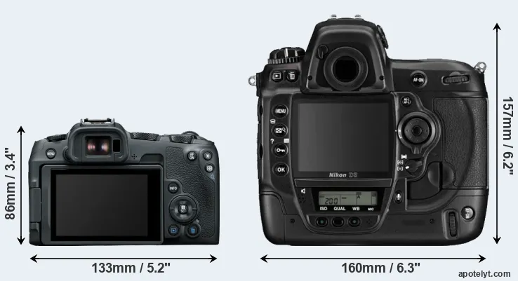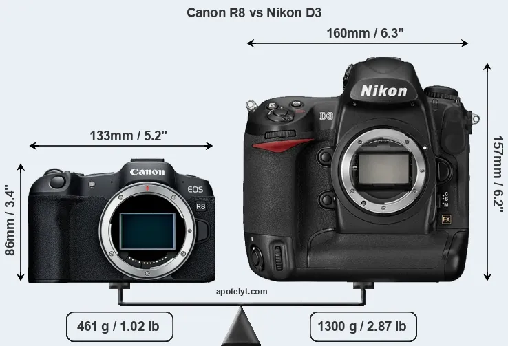 An illustration of the physical size and weight of the Canon R8 and the Nikon D3 is provided in the side-by-side display below. The two cameras are presented according to their relative size. Three consecutive views from the front, the top, and the rear side are shown. All width, height and depth measures are rounded to the nearest millimeter.