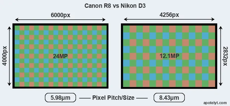 Despite having a slightly smaller sensor, the Canon R8 offers a higher resolution of 24 megapixels, compared with 12.1 MP of the Nikon D3. This megapixels advantage comes at the cost of a higher pixel density and a smaller size of the individual pixel (with a pixel pitch of 5.98μm versus 8.43μm for the D3). However, it should be noted that the R8 is much more recent (by 15 years and 5 months) than the D3, and its sensor will have benefitted from technological advances during this time that make it possible to gather light more efficiently.