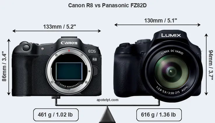 The side-by-side display below illustrates the physical size and weight of the Canon R8 and the Panasonic FZ82D. The two cameras are presented according to their relative size. Three consecutive perspectives from the front, the top, and the back are available. All width, height and depth measures are rounded to the nearest millimeter.