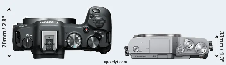 The physical size and weight of the Canon R8 and the Panasonic GX800 are illustrated in the side-by-side display below. The two cameras are presented according to their relative size. Three consecutive views from the front, the top, and the rear side are shown. All size dimensions are rounded to the nearest millimeter.