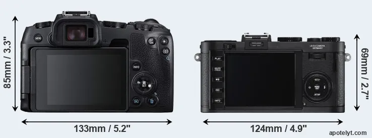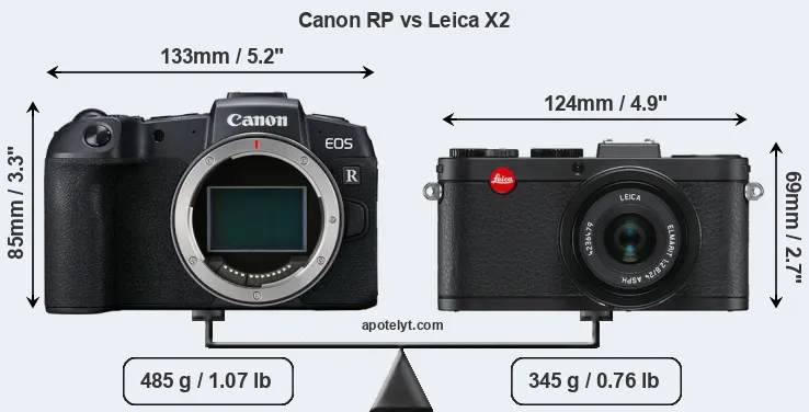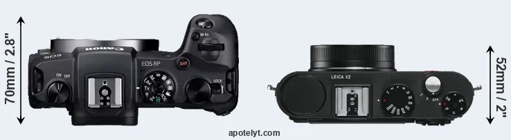 The side-by-side display below illustrates the physical size and weight of the Canon RP and the Leica X2. The two cameras are presented according to their relative size. Three consecutive perspectives from the front, the top, and the back are available. All width, height and depth measures are rounded to the nearest millimeter.