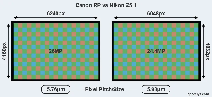 With 26MP, the RP offers a slightly higher resolution than the Z5 II (24.4MP), but the RP has smaller individual pixels (pixel pitch of 5.76μm versus 5.93μm for the Z5 II). Moreover, the Z5 II is a much more recent model (by 6 years and 1 month) than the RP, and its sensor will have benefitted from technological advances during this time that enhance the light gathering capacity of its pixels.
