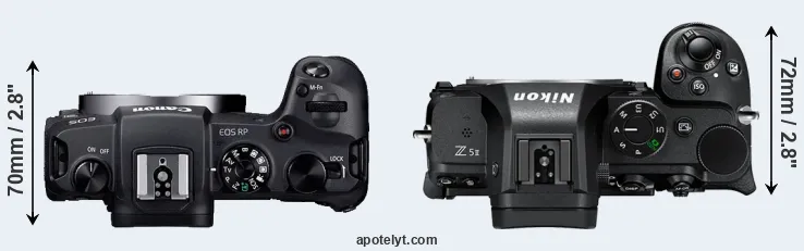 An illustration of the physical size and weight of the Canon RP and the Nikon Z5 II is provided in the side-by-side display below. The two cameras are presented according to their relative size. Three successive views from the front, the top, and the rear are shown. All width, height and depth measures are rounded to the nearest millimeter.