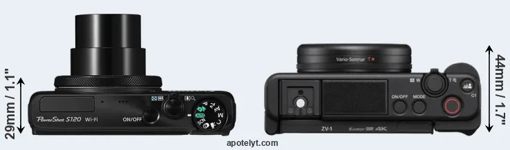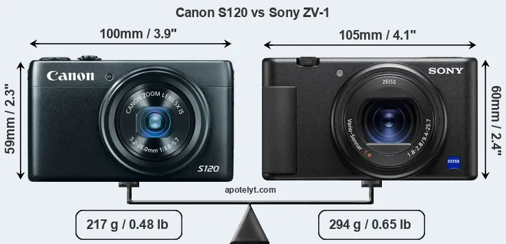 The side-by-side display below illustrates the physical size and weight of the Canon S120 and the Sony ZV-1. The two cameras are presented according to their relative size. Three consecutive views from the front, the top, and the rear side are shown. All width, height and depth dimensions are rounded to the nearest millimeter.