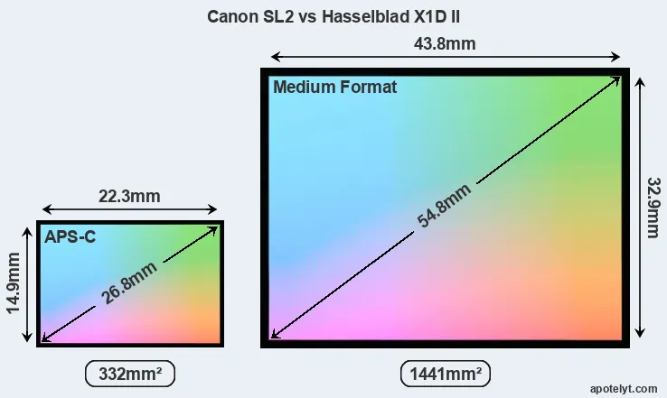 Of the two cameras under consideration, the Canon SL2 features an APS-C sensor and the Hasselblad X1D II a medium format sensor. The sensor area in the X1D II is 334 percent bigger. As a result of these sensor size differences, the cameras have a format factor of, respectively, 1.6 and 0.79. The sensor in the SL2 has a native 3:2 aspect ratio, while the one in the X1D II offers a 4:3 aspect.