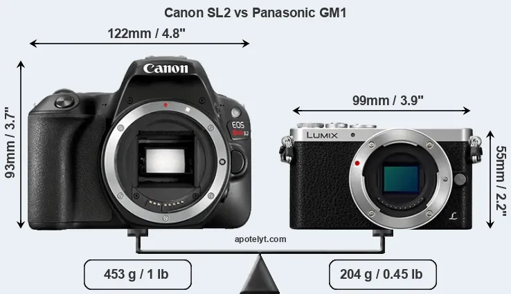 An illustration of the physical size and weight of the Canon SL2 and the Panasonic GM1 is provided in the side-by-side display below. The two cameras are presented according to their relative size. Three successive views from the front, the top, and the rear are shown. All width, height and depth dimensions are rounded to the nearest millimeter.