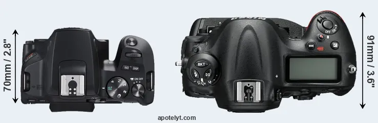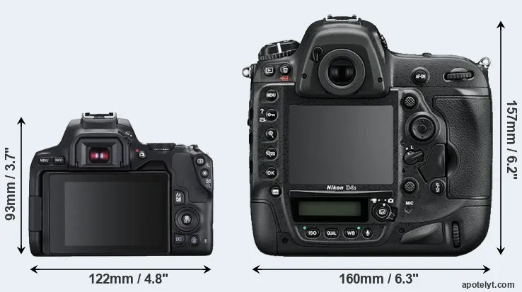 If the front view area (width x height) of the cameras is taken as an aggregate measure of their size, the Nikon D4S is considerably larger (121 percent) than the Canon SL3. Moreover, the D4S is substantially heavier (201 percent) than the SL3. It is noteworthy in this context that the D4S is splash and dust-proof, while the SL3 does not feature any corresponding weather-sealing.