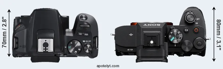 The side-by-side display below illustrates the physical size and weight of the Canon SL3 and the Sony A7 IV. The two cameras are presented according to their relative size. Three successive views from the front, the top, and the rear are shown. All width, height and depth dimensions are rounded to the nearest millimeter.