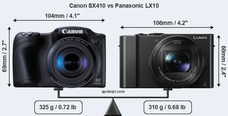 The side-by-side display below illustrates the physical size and weight of the Canon SX410 and the Panasonic LX10. The two cameras are presented according to their relative size. Three consecutive perspectives from the front, the top, and the back are available. All width, height and depth measures are rounded to the nearest millimeter.