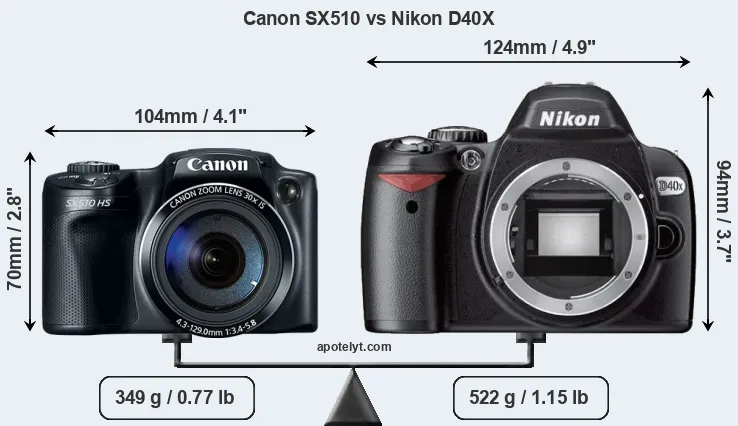 The side-by-side display below illustrates the physical size and weight of the Canon SX510 and the Nikon D40X. The two cameras are presented according to their relative size. Three successive views from the front, the top, and the rear are shown. All width, height and depth dimensions are rounded to the nearest millimeter.