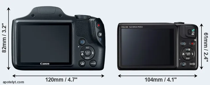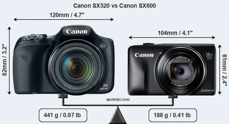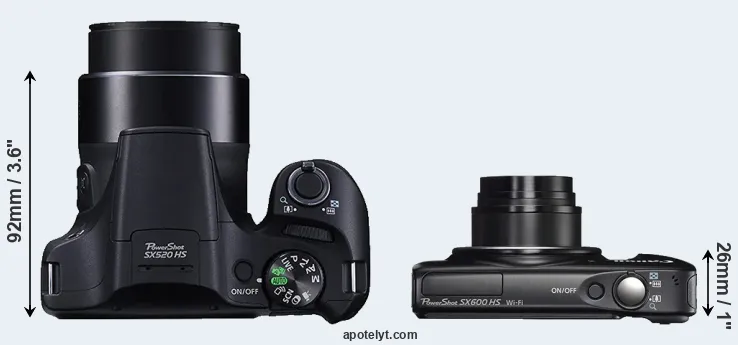 The side-by-side display below illustrates the physical size and weight of the Canon SX520 and the Canon SX600. The two cameras are presented according to their relative size. Three consecutive perspectives from the front, the top, and the back are available. All width, height and depth measures are rounded to the nearest millimeter.