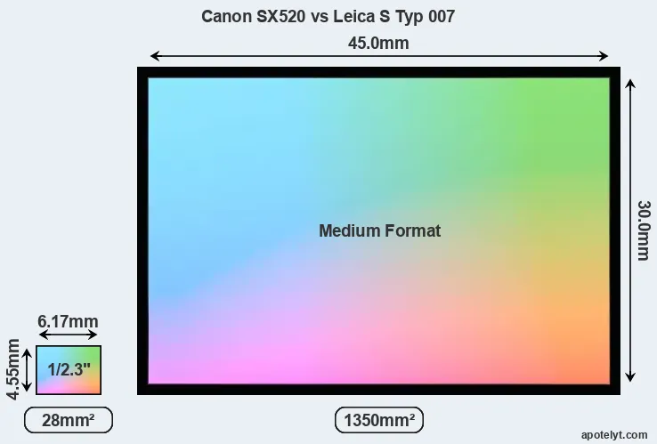 Of the two cameras under consideration, the Canon SX520 features a 1/2.3-inch sensor and the Leica S Typ 007 a medium format sensor. The sensor area in the S Typ 007 is 4721 percent bigger. As a result of these sensor size differences, the cameras have a format factor of, respectively, 5.6 and 0.8. The sensor in the SX520 has a native 4:3 aspect ratio, while the one in the S Typ 007 offers a 3:2 aspect.