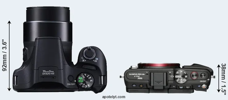 The physical size and weight of the Canon SX520 and the Olympus E-PL6 are illustrated in the side-by-side display below. The two cameras are presented according to their relative size. Three consecutive views from the front, the top, and the rear side are shown. All width, height and depth measures are rounded to the nearest millimeter.