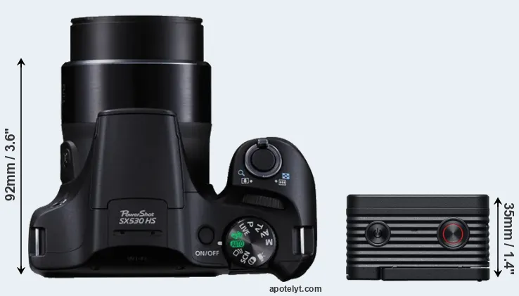 The side-by-side display below illustrates the physical size and weight of the Canon SX530 and the Sony RX0 II. The two cameras are presented according to their relative size. Three consecutive perspectives from the front, the top, and the back are available. All width, height and depth measures are rounded to the nearest millimeter.