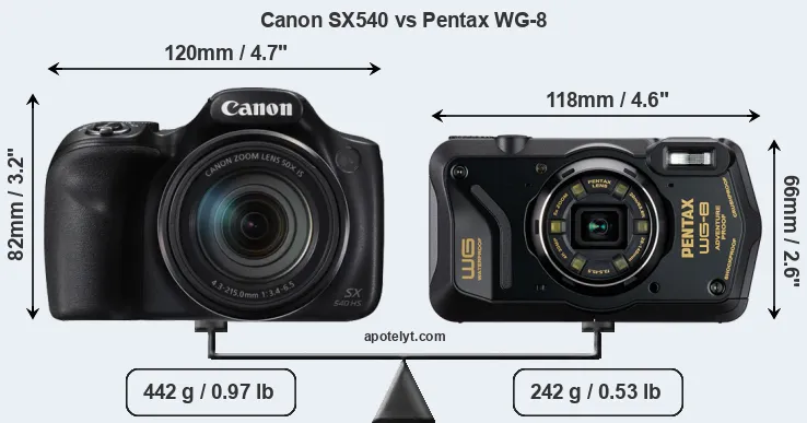 The side-by-side display below illustrates the physical size and weight of the Canon SX540 and the Pentax WG-8. The two cameras are presented according to their relative size. Three consecutive views from the front, the top, and the rear side are shown. All width, height and depth measures are rounded to the nearest millimeter.