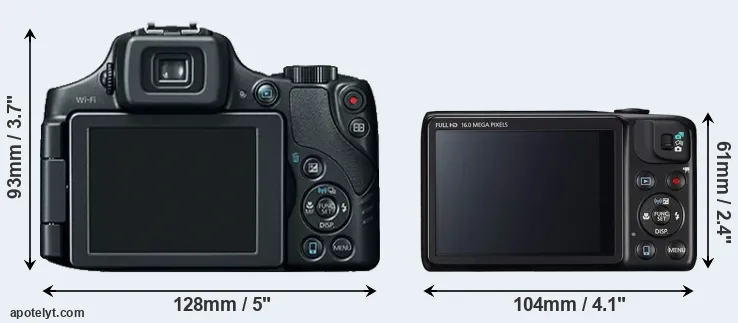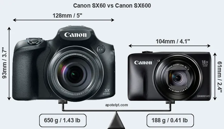 The side-by-side display below illustrates the physical size and weight of the Canon SX60 and the Canon SX600. The two cameras are presented according to their relative size. Three consecutive views from the front, the top, and the rear side are shown. All width, height and depth dimensions are rounded to the nearest millimeter.