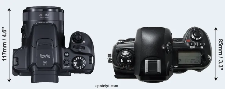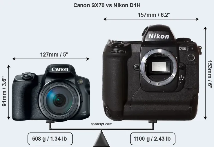 The side-by-side display below illustrates the physical size and weight of the Canon SX70 and the Nikon D1H. The two cameras are presented according to their relative size. Three consecutive perspectives from the front, the top, and the back are available. All width, height and depth measures are rounded to the nearest millimeter.
