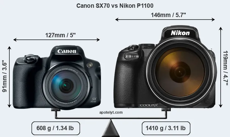 If the front view area (width x height) of the cameras is taken as an aggregate measure of their size, the Nikon P1100 is considerably larger (50 percent) than the Canon SX70. Moreover, the P1100 is substantially heavier (132 percent) than the SX70. In this context, it is worth noting that neither the SX70 nor the P1100 are weather-sealed.