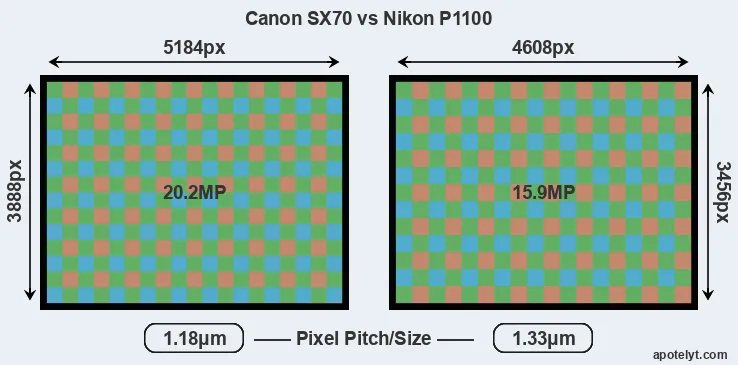 While the two cameras under review share the same sensor size, the SX70 offers a higher resolution of 20.2 megapixels, compared with 15.9 MP of the P1100. This megapixels advantage translates into a 13 percent gain in linear resolution. On the other hand, these sensor specs imply that the SX70 has a higher pixel density and a smaller size of the individual pixel (with a pixel pitch of 1.18μm versus 1.33μm for the P1100). Moreover, it should be noted that the P1100 is much more recent (by 6 years and 4 months) than the SX70, and its sensor will have benefitted from technological advances during this time that further enhance the light gathering capacity of individual pixels. Coming back to sensor resolution, it should be mentioned that neither of the two cameras has an anti-alias filter installed, so they are able to capture all the detail the sensor resolves.