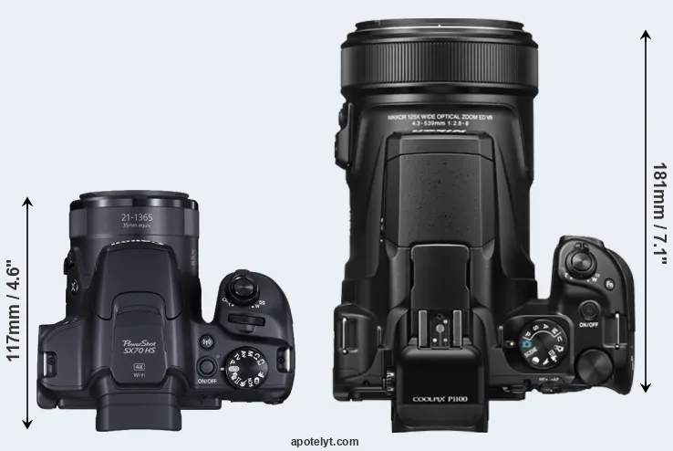 The physical size and weight of the Canon SX70 and the Nikon P1100 are illustrated in the side-by-side display below. The two cameras are presented according to their relative size. Three consecutive views from the front, the top, and the rear side are shown. All size dimensions are rounded to the nearest millimeter.