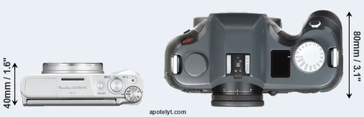 The above size and weight comparisons are to some extent incomplete and possibly misleading, as the SX730 has a lens built in, whereas the S-E Typ 006 is an interchangeable lens camera that requires a separate lens. Attaching the latter will add extra weight and bulk to the setup.