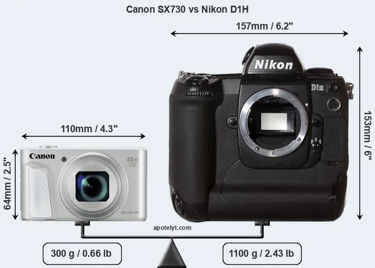 If the front view area (width x height) of the cameras is taken as an aggregate measure of their size, the Nikon D1H is considerably larger (241 percent) than the Canon SX730. It is noteworthy in this context that the D1H is splash and dust-proof, while the SX730 does not feature any corresponding weather-sealing.