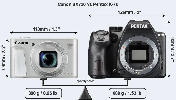 If the front view area (width x height) of the cameras is taken as an aggregate measure of their size, the Pentax K-70 is considerably larger (66 percent) than the Canon SX730. It is noteworthy in this context that the K-70 is splash and dust-proof, while the SX730 does not feature any corresponding weather-sealing.