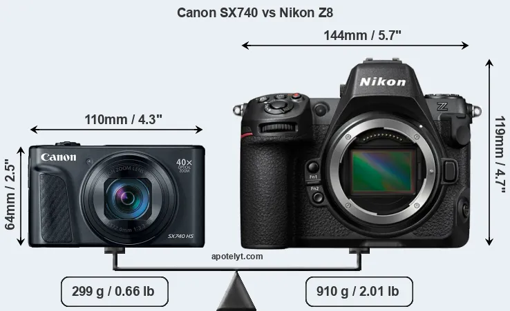 If the front view area (width x height) of the cameras is taken as an aggregate measure of their size, the Nikon Z8 is considerably larger (143 percent) than the Canon SX740. It is noteworthy in this context that the Z8 is splash and dust-proof, while the SX740 does not feature any corresponding weather-sealing.