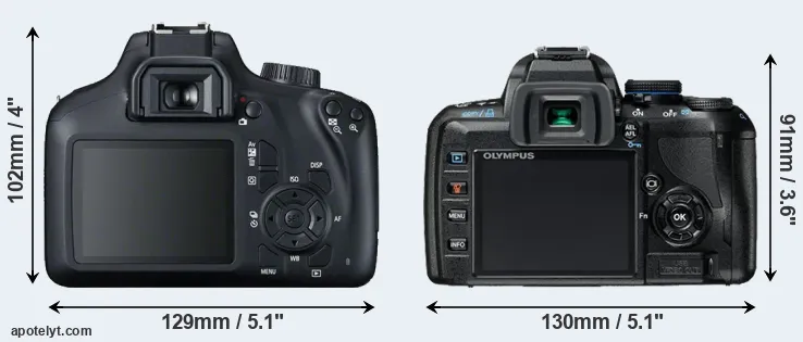 The side-by-side display below illustrates the physical size and weight of the Canon T100 and the Olympus E-420. The two cameras are presented according to their relative size. Three consecutive perspectives from the front, the top, and the back are available. All width, height and depth measures are rounded to the nearest millimeter.