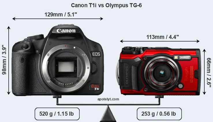 An illustration of the physical size and weight of the Canon T1i and the Olympus TG-6 is provided in the side-by-side display below. The two cameras are presented according to their relative size. Three consecutive perspectives from the front, the top, and the back are available. All size dimensions are rounded to the nearest millimeter.