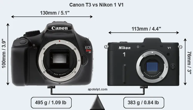 An illustration of the physical size and weight of the Canon T3 and the Nikon 1 V1 is provided in the side-by-side display below. The two cameras are presented according to their relative size. Three consecutive perspectives from the front, the top, and the back are available. All size dimensions are rounded to the nearest millimeter.